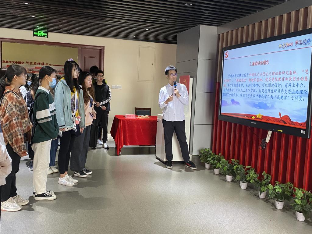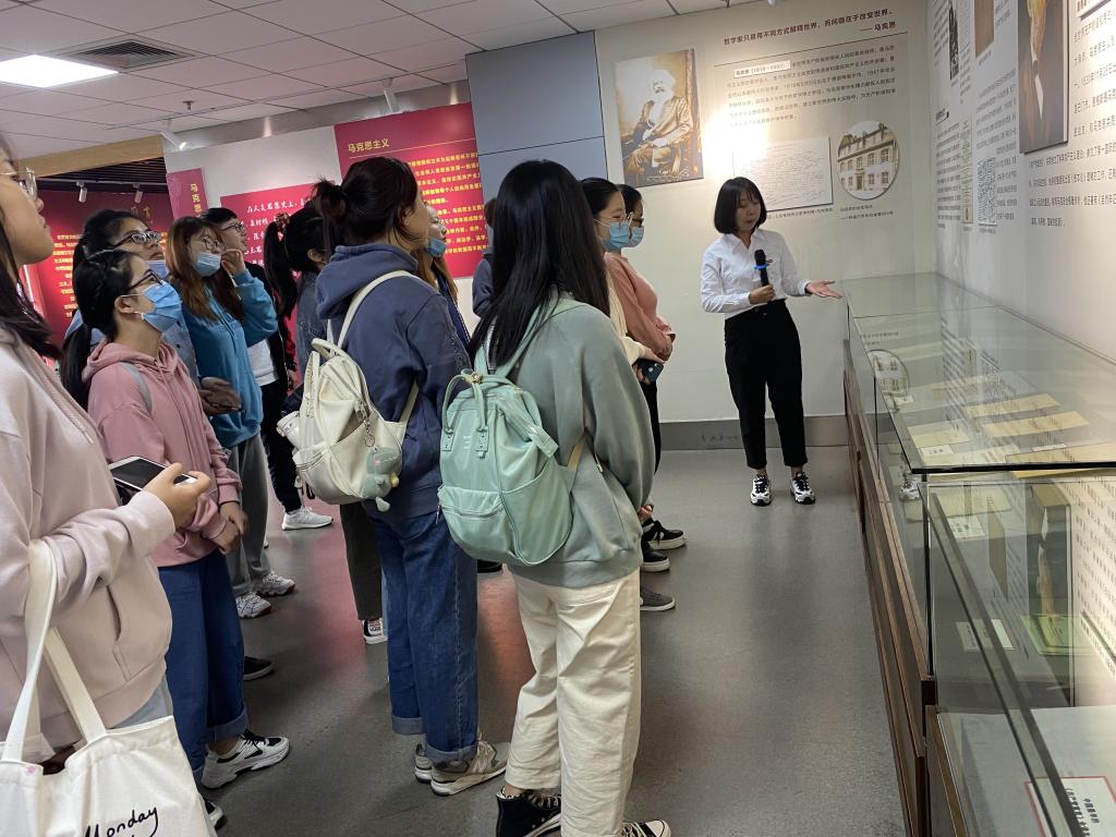 马克思主义中国化研究与传播中心坐落于学校逸夫图书馆7楼,主要由前厅、马克思主义中国化成果展厅、党群活动中心、互动体验区和马克思主义中国化传播研究所组成。在中心,我们可以看到《共产党宣言》手稿的德文版、全国首个中文全译本、毛泽东批注过的《中国共产党宣言》、纪念币零欧元、马藏和各个版本的《习近平谈治国理政》等珍贵文献资料。在马克思主义学院研究生讲解员声情并茂的讲解下,同学们通过参观系列文献资料和展品,进一步加深了对马克思主义中国化传播和发展历程的了解,更加深入地认识了我国共产主义先驱人物为实现中华民族伟大复兴进行探索追求的坚定信念和不懈奋斗。