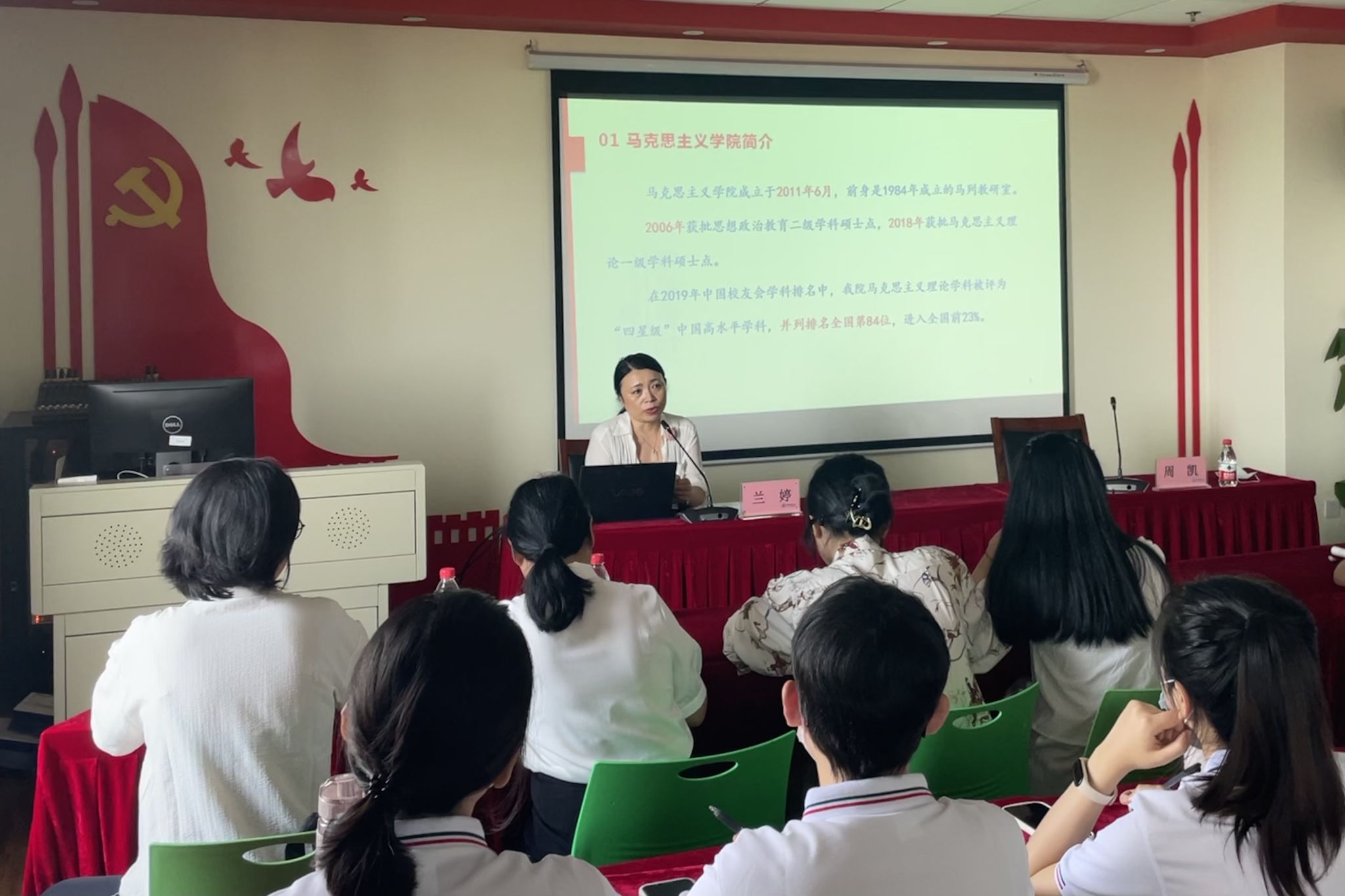 兰婷代表全体师生对新生加入马克思主义学院大家庭表示热烈的欢迎与诚挚的祝贺。她向同学们介绍了学院基本情况以及近年来的良好发展态势,并对马克思主义理论学科设置、研究方向、师资队伍以及获奖情况等进行了全景式介绍,还针对学习过程中可能遇到的问题与在场的同学们进行了深入交流。