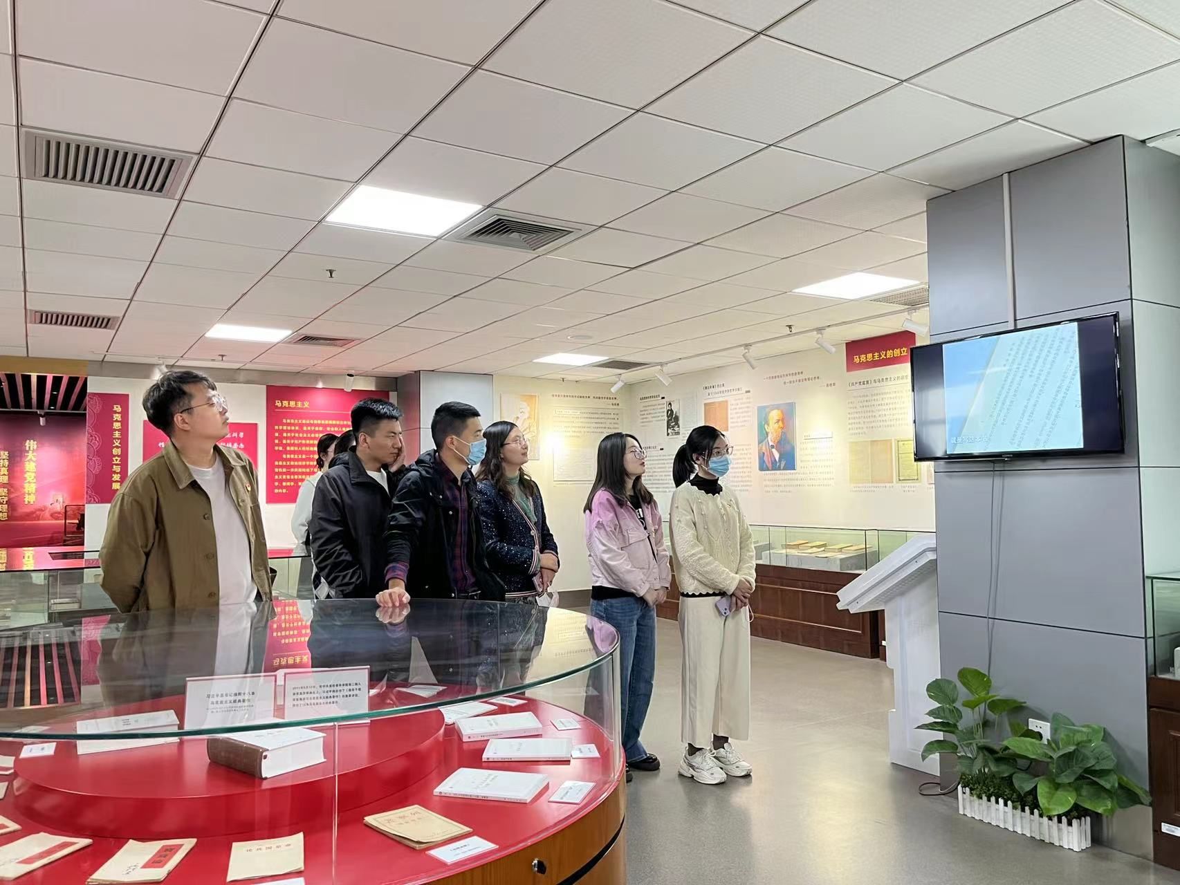 在参观伊始,大家通过宣传片对马克思主义中国化研究与传播中心的特色和功能有了大致了解,随后有序参观了马克思恩格斯列宁著作展厅、毛泽东思想展厅、中国特色社会主义理论展厅,并着重了解了习近平新时代中国特色社会主义思想展厅。在参观过程中,大家观看了习近平总书记讲述“真理的味道非常甜”的小故事以及开国大典彩色版视频